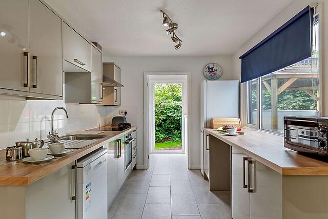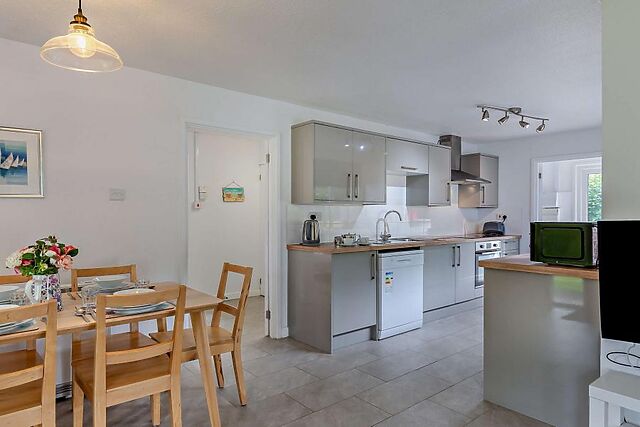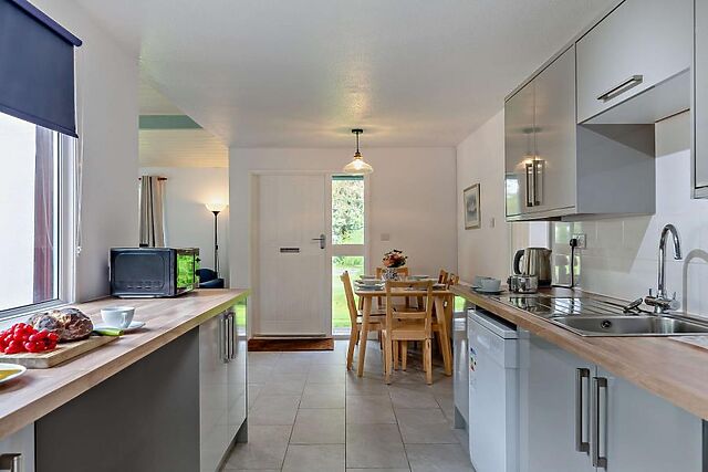 - Patio doors in the lounge lead outside and offer woodland views or the option to relax in front of the TV. - A neat kitchen is equipped with appliances for family meals, with space to dine indoors or at the patio table outside.