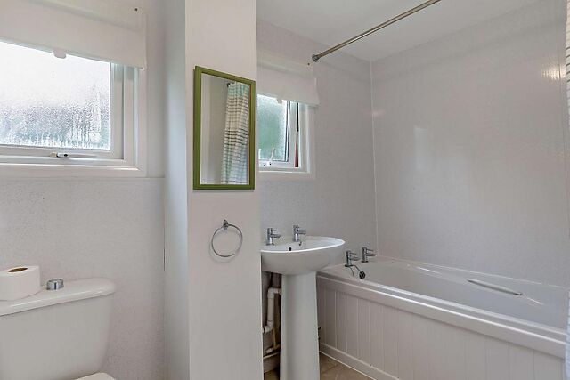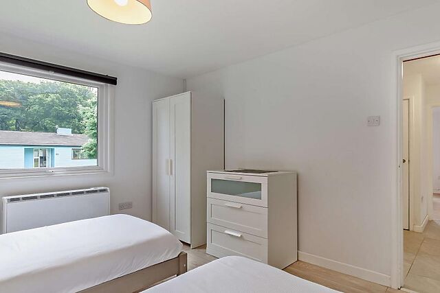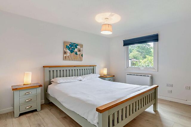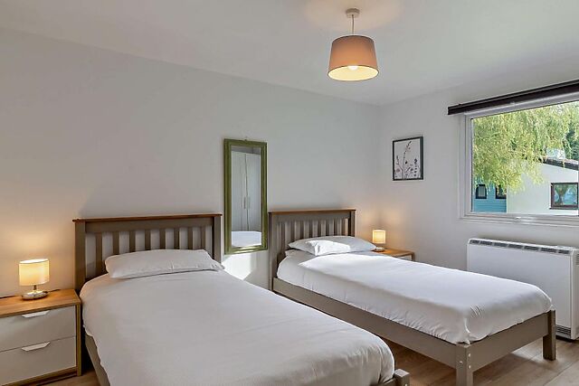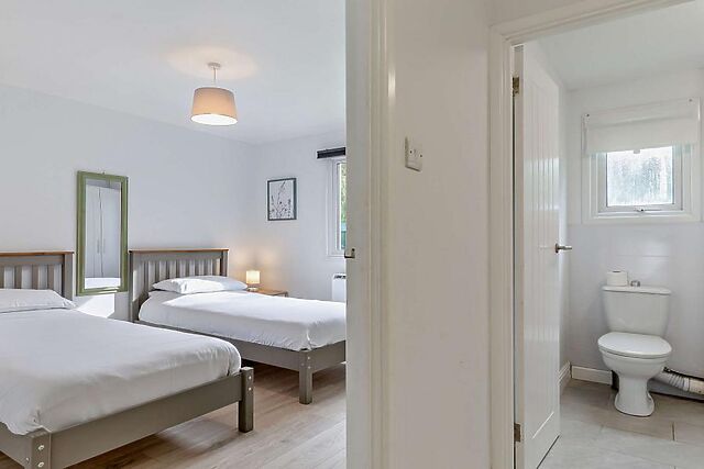 - Guests can choose between a king-size bedroom and a twin bedroom, both featuring tranquil, whitewashed walls and wood-panelled flooring. - There is a modern bathroom shared by both bedrooms.