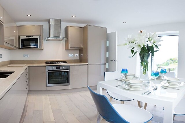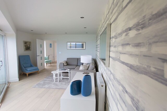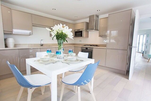 Leave your vehicle in an off-road parking space outside the front door, before stepping inside to the first floor to discover the open-plan living space, bathed in natural light with its sliding doors and scenic 180-degree sea views over the beautiful sandy bay. Unwind on the sofa with a cup of tea in hand as you savour the sights or flick through the TV for a Sky movie, where you can snuggle together with a bucket of popcorn.
