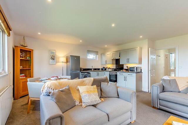 Follow the hall into the open-plan lounge/kitchen/diner, where you can open the French doors on warm summer days. Settle on the comfortable seating to chat or watch the Smart TV.