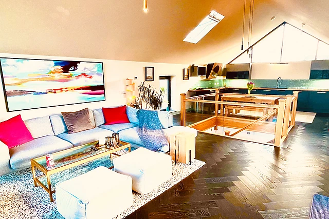 The open-plan living space, located on the first floor, is a haven of modernity and warmth, complete with a high-spec kitchen and a balcony offering village views.
