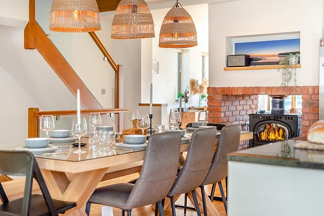 Set over three floors, Beach Haven boasts a well-equipped kitchen, a cosy lounge with a log burner, and a dining area that opens onto a sunny balcony.