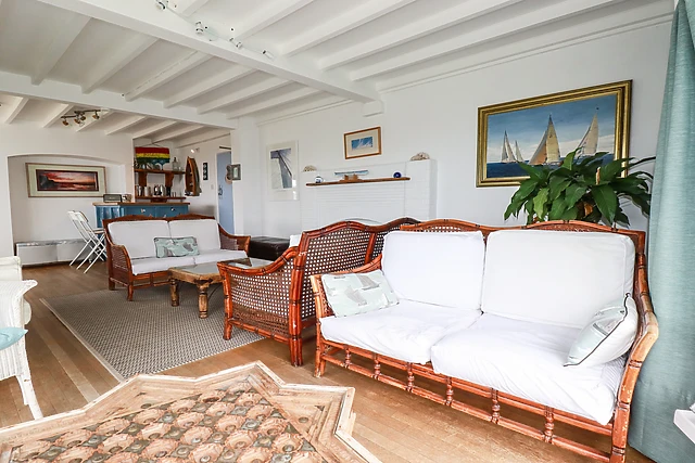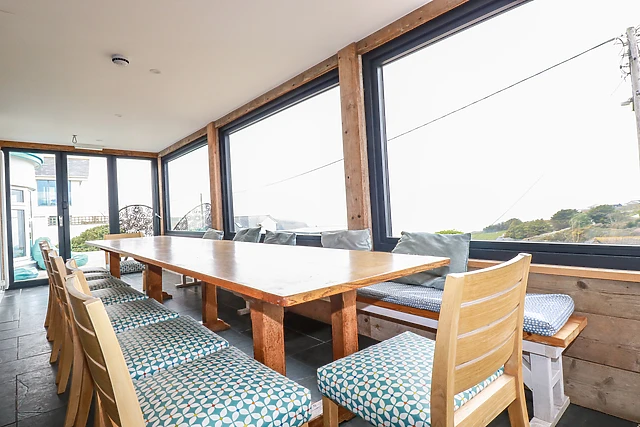 Imagine unwinding in the bubbling hot tub with a backdrop of sea views, or gathering in the expansive open-plan living area, where a 250-year-old wooden table stands ready for memorable dinners.
