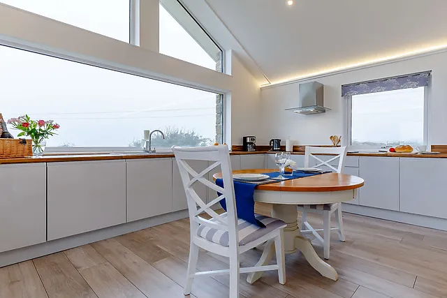 The open-plan lounge/kitchen/diner, with vaulted ceilings and expansive windows, offers breathtaking views. The kitchen is fully equipped for romantic meals, and the lounge is a cosy spot to unwind with a smart TV.