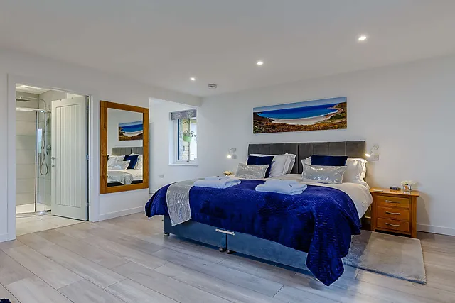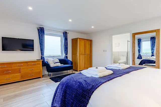 The bedroom features a super-king-size zip-and-link bed, which can be made up as twin beds upon request, offering flexible sleeping arrangements to suit your preferences.