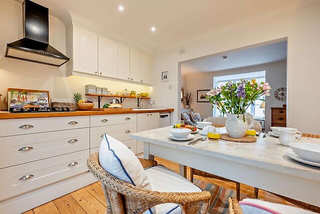 The welcoming lounge has elegant wooden floors and a classic fireplace housing a wood burner for evening relaxation on chilly evenings. The heart of the home is the kitchen/dining room, which combines contemporary functionality with period elegance.