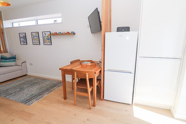The open-plan area is stylish and contemporary, featuring a well-equipped kitchen where you can prepare delicious meals for your loved one. Enjoy your culinary creations at the dining table, offering seating for two guests, before retiring to the sitting area.