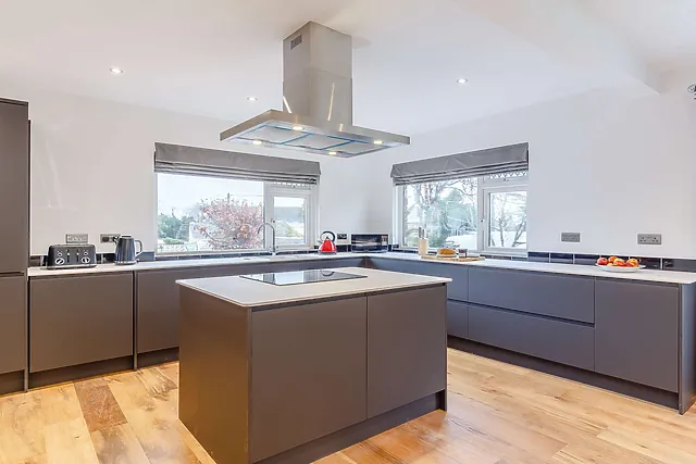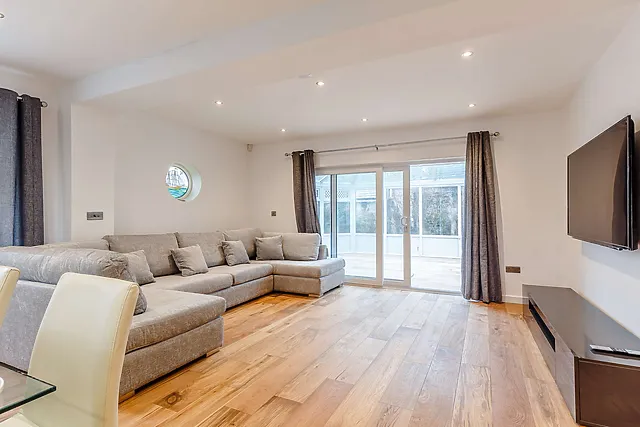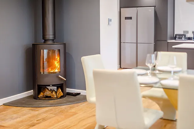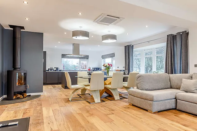The open-plan living area, complete with a wood burner, provides a cosy atmosphere, while the separate snug with a gaming area ensures entertainment for all.