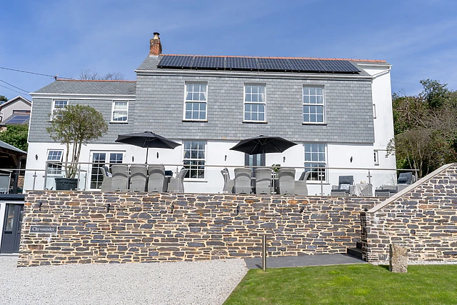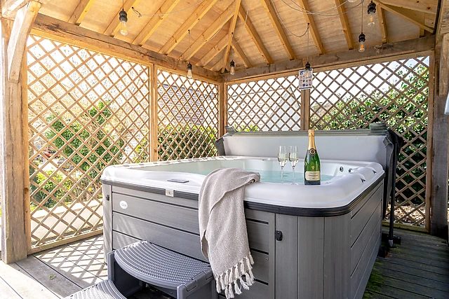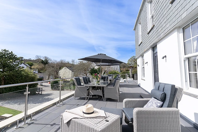 Two more sitting rooms await your relaxation, including a snug/study with a desk and selection of books and games, and a pretty sunroom outfitted with tasteful furniture and beanbags, whilst French windows open up onto the raised patio. The front patio terrace is the ideal spot for alfresco dining or to relaxing on the sun loungers with a glass of your favourite beverage, and this garden also offers the indulgent treat of a bubbling hot tub.