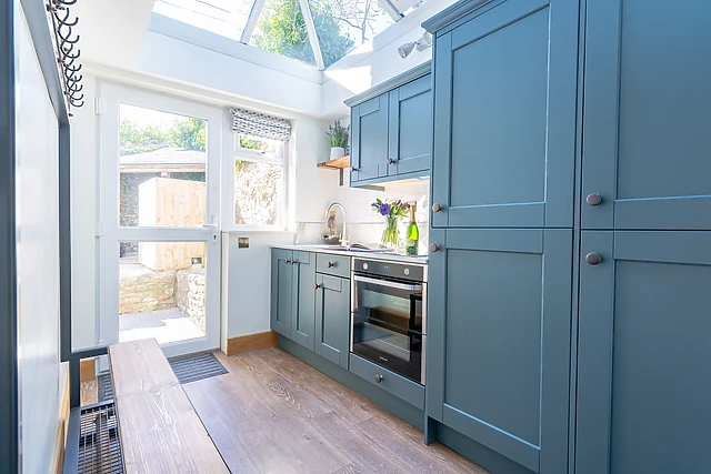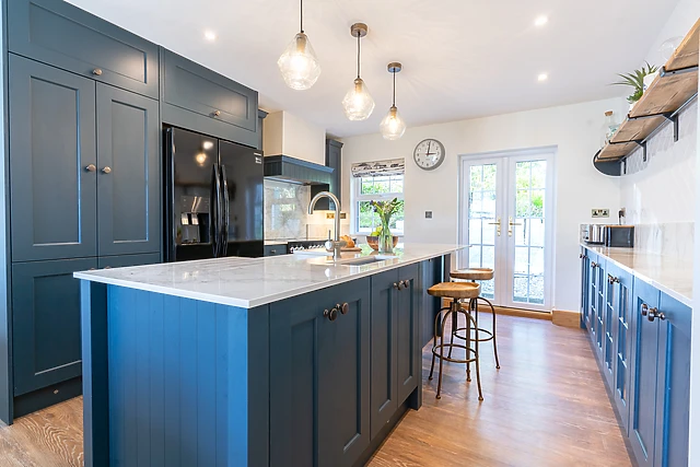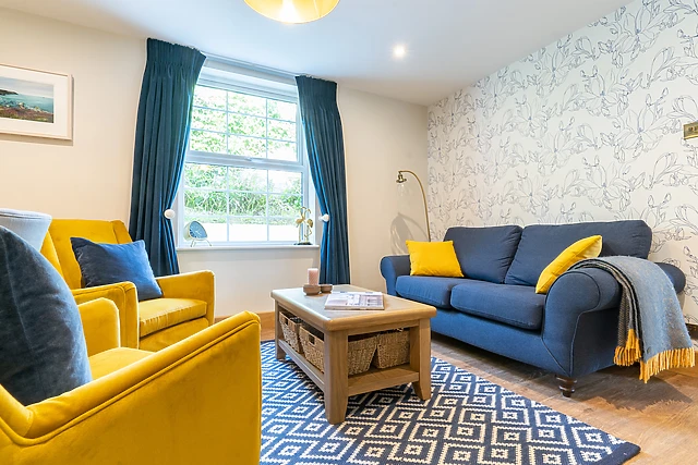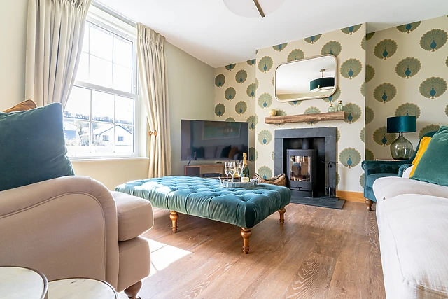 Be welcomed into a contemporary kitchen/diner with beautiful deep blue furniture, ample amenities and a large wooden dining table ideal for indulging in heart-warming family meals, and there is also the option of a second kitchen on the other side of the property. The sitting room continues the breath-taking opulence of the dining space, with a selection of stylish sofas, matching tastefully with the unique peacock feature wall, housing a welcoming woodburning stove.