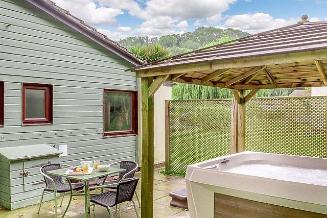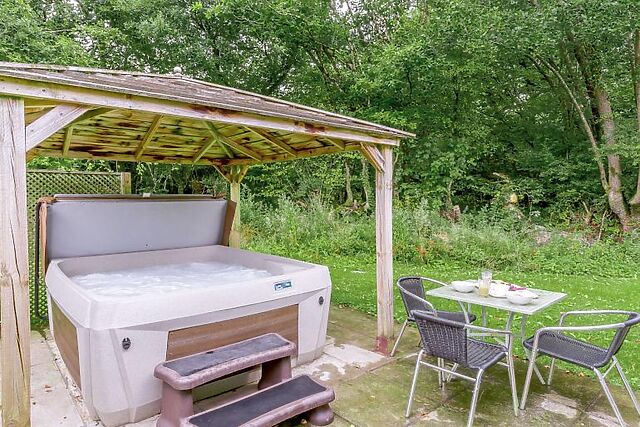 Unwind in the comfortable lounge area with an open fire, ideal for cosy evenings in. Step outside to enjoy the patio with garden furniture, where the hot tub awaits to soak away your stresses.