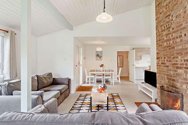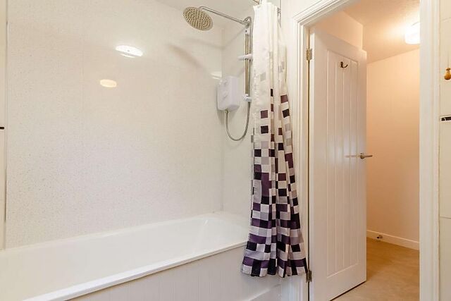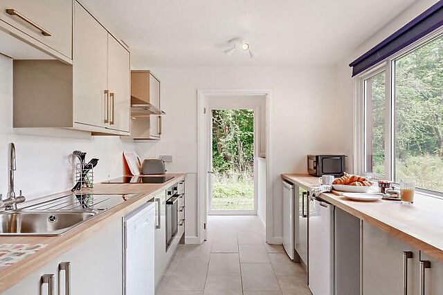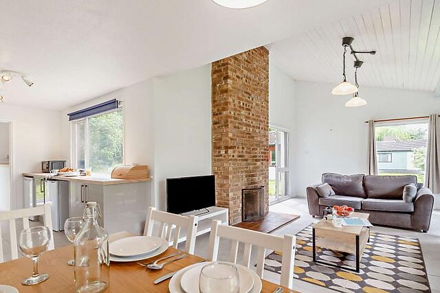 The open plan living space, complete with an electric oven, hob, microwave, and fridge/freezer, ensures you have everything you need for a self-catered stay.