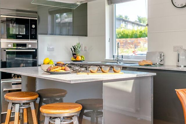 Relax on the comfortable seating as you flick through the Smart TV. Make your way over to the gleaming kitchen space to prepare drinks and meals for your party.