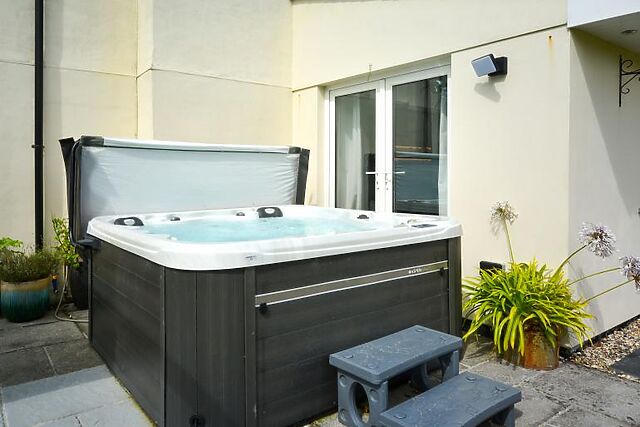 The enclosed garden is a highlight, featuring a lawn, terrace, and a luxurious hot tub. Enjoy al fresco dining while listening to the soothing sounds of nature.