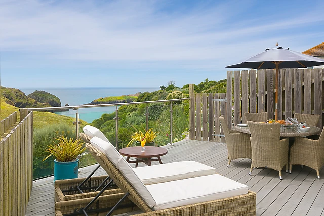 Daphne, a beautifully-presented, end-terrace abode set along the picturesque coast of Cornwall in Mullion. With exceptional panoramic views, a delightful interior, and a hot tub, this reverse-level abode welcomes families and friends, idyllic for a tranquil escape by the sea.