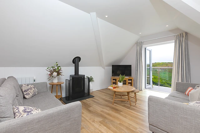 Here, you can rustle up evening meals in the fully-equipped kitchen, toast to a magical holiday around the dining table, and sink into the plush seating for a movie night as the gas fire creates a warm and welcoming backdrop, ideal for those chillier nights. In the warmer months, open the balcony doors and enjoy breakfast outside with your loved one, whilst the soothing sound of the waves in the background, creates a truly tranquil experience.