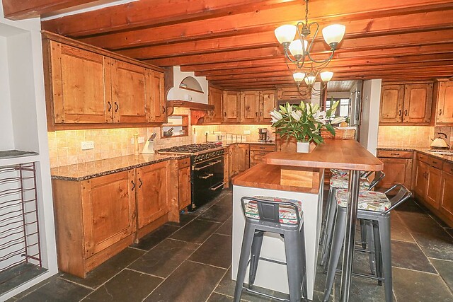 From here you are taken into the relaxing conservatory overlooking the garden and the valley beyond. On the other side of the house, the dining room comfortably sits ten around a solid oak table and this leads you through into the sitting room with a woodburner and a large settee along two of the walls big enough to seat all the family.