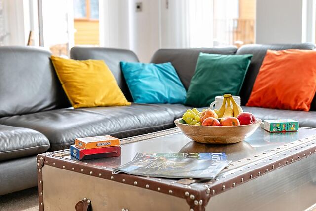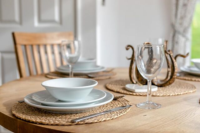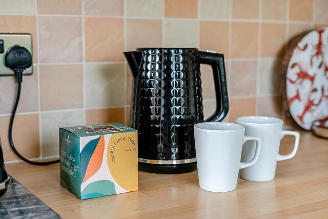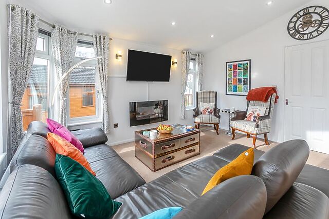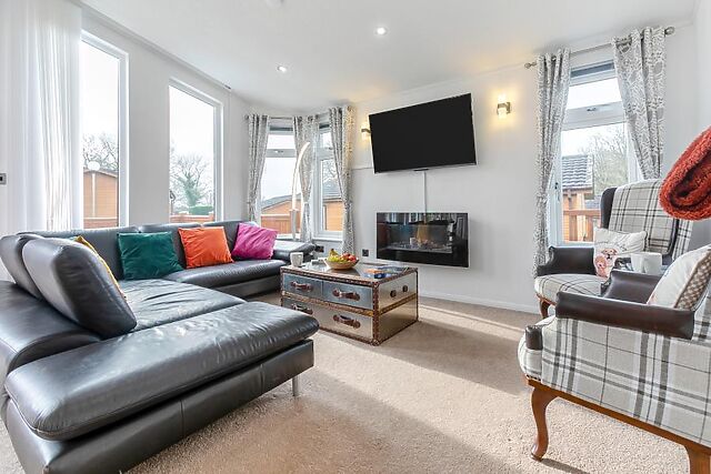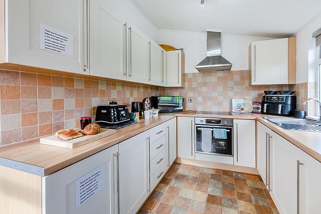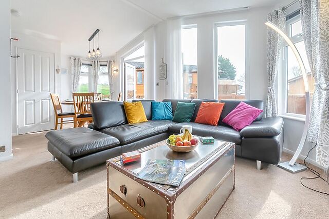The lounge features an inviting L-shaped sofa, an electric fire and a Smart TV, alongside a circular dining table perfect for shared meals or board games. The kitchen, also within this space, is extremely well equipped with everything you might need during your stay.