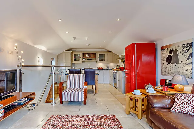 The open-plan living area, complete with a wood burner, is ideal for relaxing evenings, while the fully equipped kitchen allows for delightful home-cooked meals.