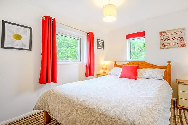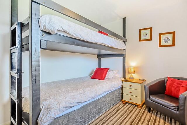 The accommodation comfortably sleeps up to 5 guests in two cosy bedrooms, featuring a double bed and a single with bunk beds.