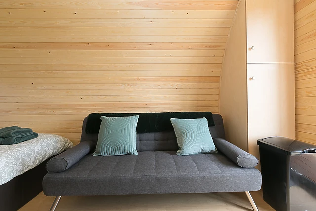 The pod, accommodating two guests, offers a cosy studio-style layout complete with a double bed, kitchenette, dining area, and sitting area.