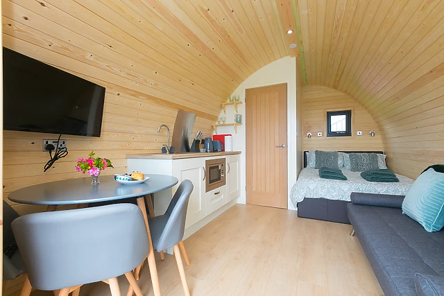 The pod is equipped with gas central heating and underfloor heating, providing a warm and cosy atmosphere throughout your stay.