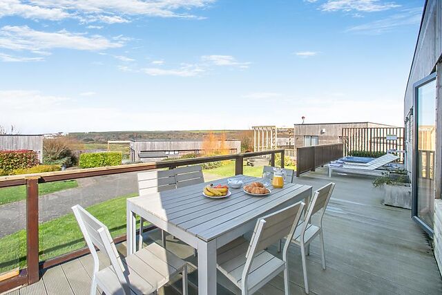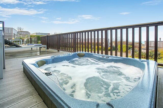 The master bedroom has a TV for relaxing mornings, and also boasts an en-suite shower room with a WC for added convenience. Head outside to unwind in your private sunken hot tub, take it easy on the sun loungers, or reconvene around the seating for a breakfast buffet to remember.