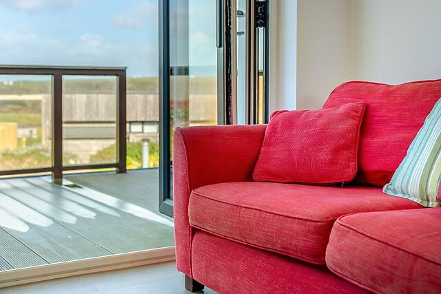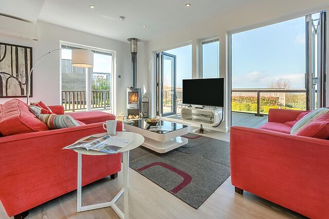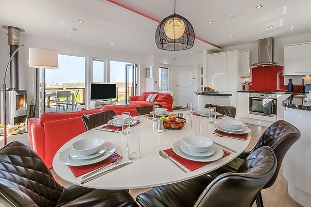 Step onto the decking and into the open-plan living space. This lounge/kitchen/diner is decorated in statement reds and whites, creating an inviting atmosphere from the moment you arrive.