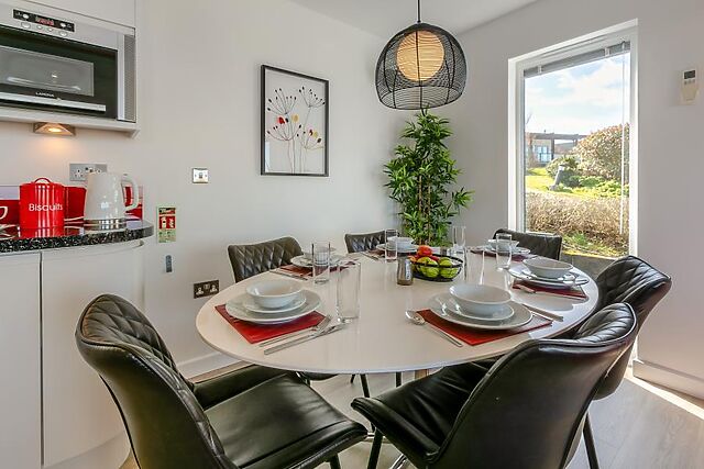 The lounge space, with a toasty wood burner and Smart TV, is an ideal place to warm up after beach strolls, while the whitewashed kitchen has all the equipment you could need to whip up lovely dishes. When the food is ready, gather at the adjacent oval table that seats six.