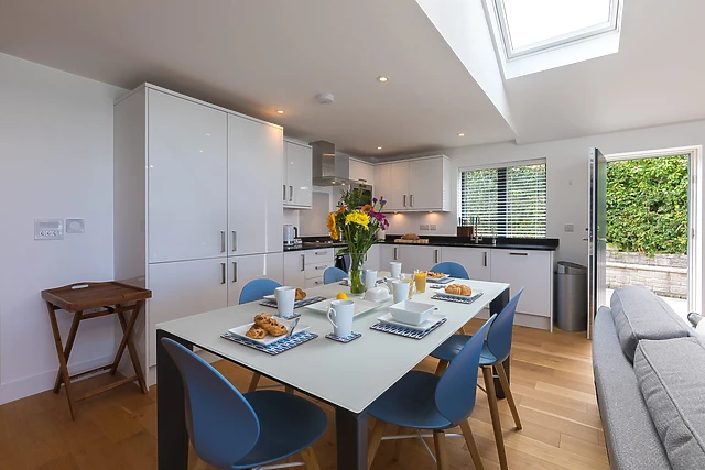 Bi-folding doors open onto a balcony, inviting the sea breeze into a beautifully appointed space that includes a state-of-the-art kitchen and a dining area perfect for gathering with loved ones.