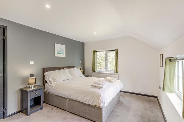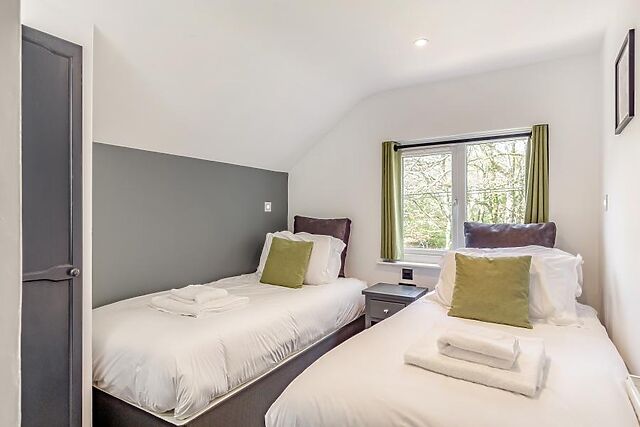Two restful bedrooms include one double and one twin, each thoughtfully furnished with built-in wardrobes for easy storage and a dressing table and mirror for getting ready. A stylish shower room features a refreshing rainfall shower.