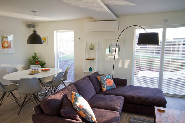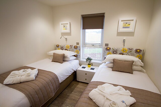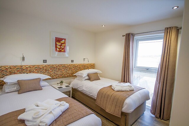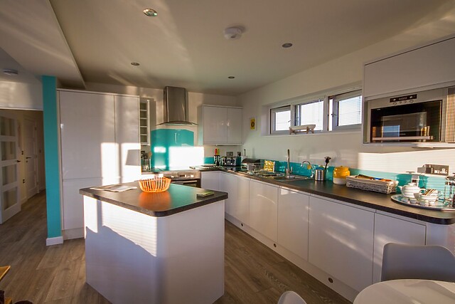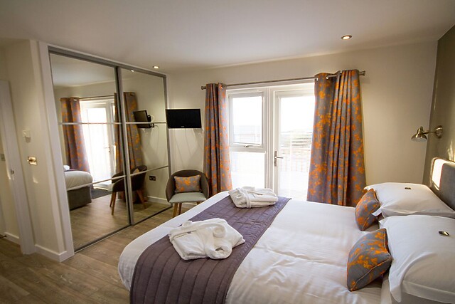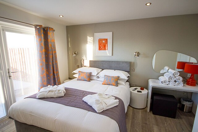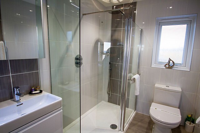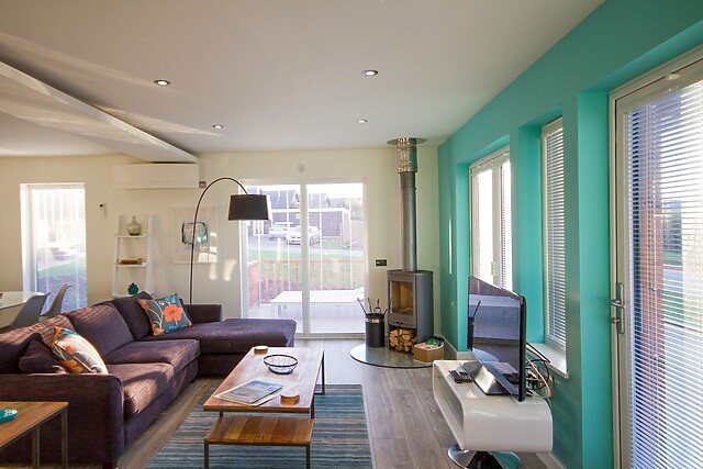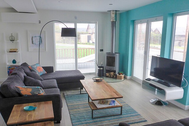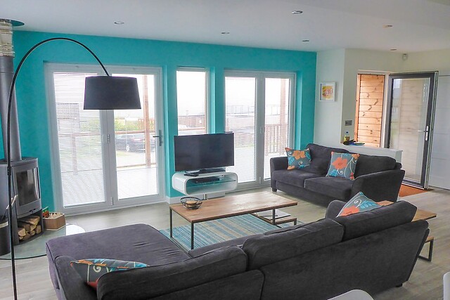 The lodge interior is spacious and beautifully styled for comfort, with an open-plan living concept which creates a fabulous social space with generous sofas around the Smart TV and modern woodburner for those cosier evenings, a fully equipped kitchen with breakfast bar island, and a dining area for breakfasts and feasts, a place to plan the next days adventure. The onsite restaurant offers good food when you’ve had an energetic day at the beach and prefer not to cook.