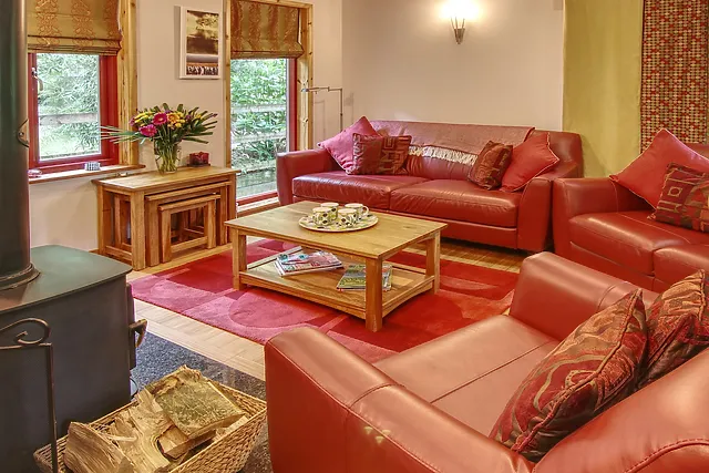 The open plan living space, complete with a wood burner and smart TV, offers a cosy setting for family gatherings.