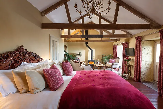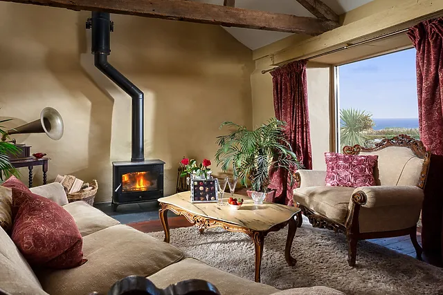 A stylish bathroom with a Victorian oval wash basin and a double-ended slipper bath adds to the charm. The living room boasts a large wood burner and bespoke furniture, perfect for cosy evenings.