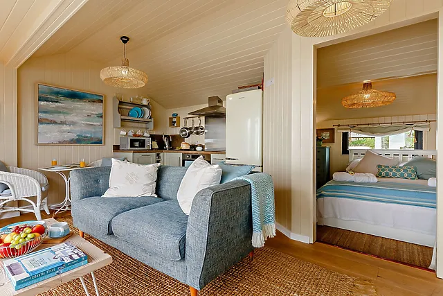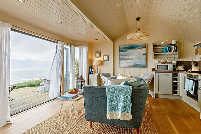 The accommodation is a one-bedroom beach hut, complete with a cosy en-suite shower room. The open-plan living area, with its comfortable sofas and Smart TV, is ideal for relaxing while gazing out at the ever-changing tides.