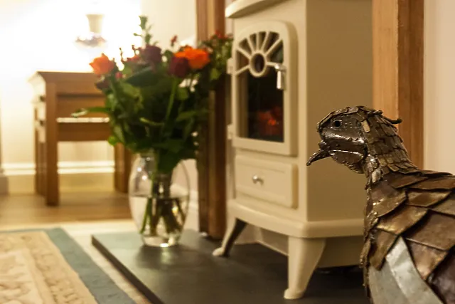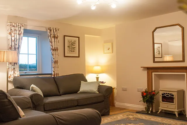 The open-plan living space, complete with a wood burner effect electric fire and Smart TV, provides a cosy atmosphere to unwind after a day of exploration.