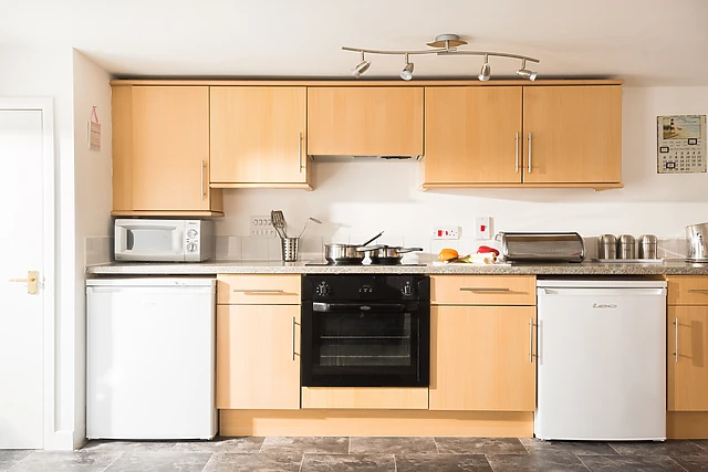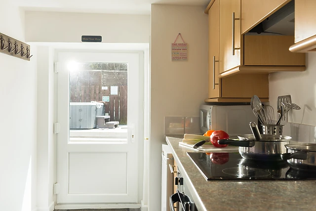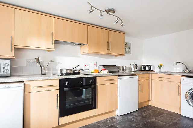 Look forward to a relaxing evening in the sitting room with two large leather sofas to sink into with beautiful sea views out of the window, whilst the TV provides the entertainment. Resting behind this is a lovely fitted kitchen with wooden units and sleek granite worktops, housing a range of appliances for cooking up some delicious meals, with a washing machine as an added benefit so you don't have to bring your whole wardrobe with you!