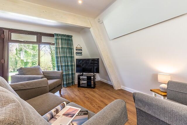Step into the light and airy open-plan living area, complete with a comfortable sofa, two armchairs, and a Smart TV with a DVD player.