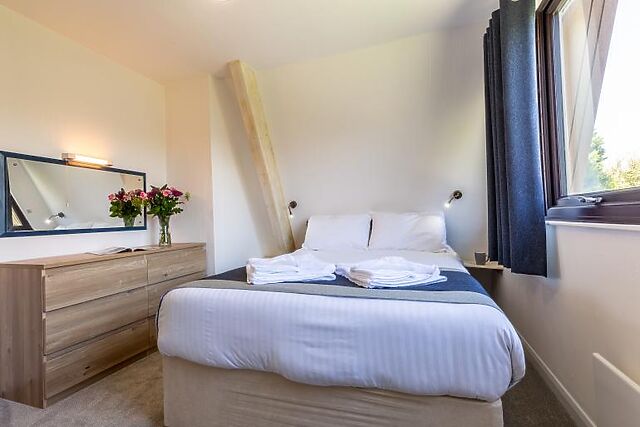 The lodge features two stylish bedrooms, one double and one twin, offering a comfortable and restful stay.