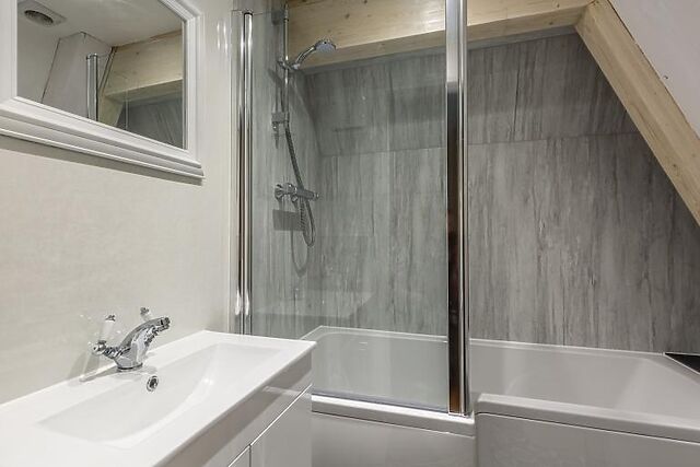The fully equipped kitchen allows you to prepare delicious meals, which you can enjoy together around the dining table. The ground floor also includes a modern bathroom with a shower over the bath.
