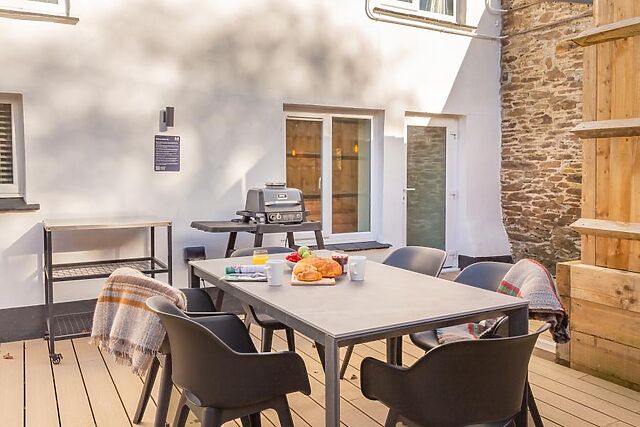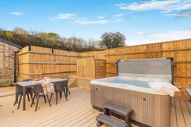 Outside, the private fenced garden terrace is a lovely all-weather space, with outdoor heaters, dining furniture and a BBQ for easy al fresco meals. A decked area houses the private hot tub for a blissful soak under the stars.