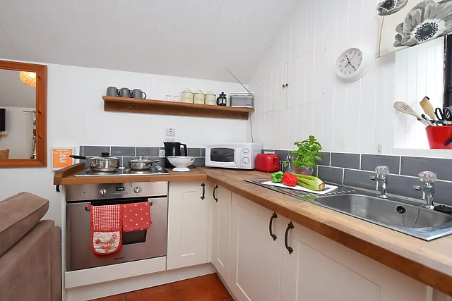 The accommodation sleeps two and features a charming open-plan design with a comfortable double bed, contemporary kitchen, and a separate shower room.