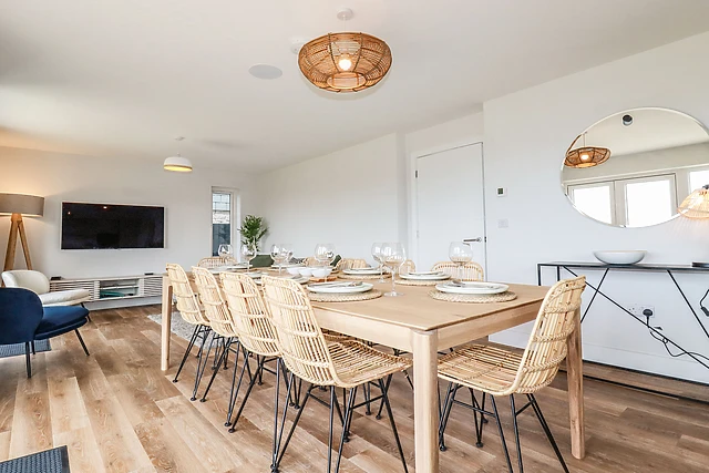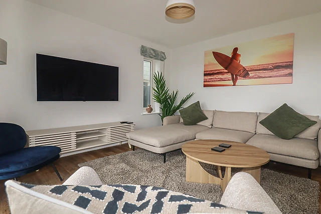 Park up on the private driveway before travelling through the enclosed front garden, reaching the entrance to your new home-from-home. Firstly, arrive to a stylish sitting room, complete with a plush corner sofa and Smart 65†OLED TV for entertainment, where you can unwind after a day of travelling.