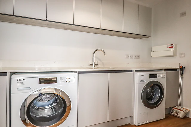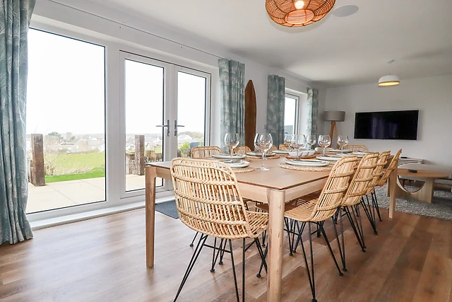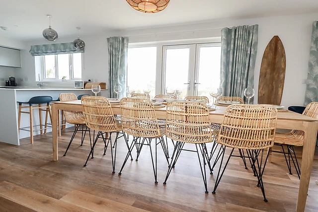 For some peace and quiet away from the heart of the home, locate the snug, offering the perfect nook to delve into a good book or plan your coming days. Continue through to the open-plan living space, flooded with natural light and adorned with sleek furnishings, including a lofty ten-seater dining table, a handy breakfast bar, a Smart TV, a fully-integrated kitchen, with all essential appliances, and a neighbouring utility with washing machine and tumble dryer.