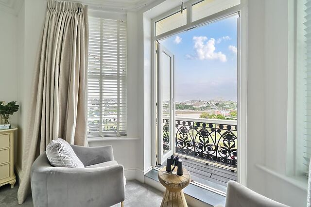 Across the upper floors, all nine bedrooms are thoughtfully designed for comfort and privacy, each benefiting from an en-suite bath or shower room. Several bedrooms enjoy sea views, with two bedrooms opening onto private balconies and bedroom one featuring its own roof garden, offering a peaceful outdoor retreat.