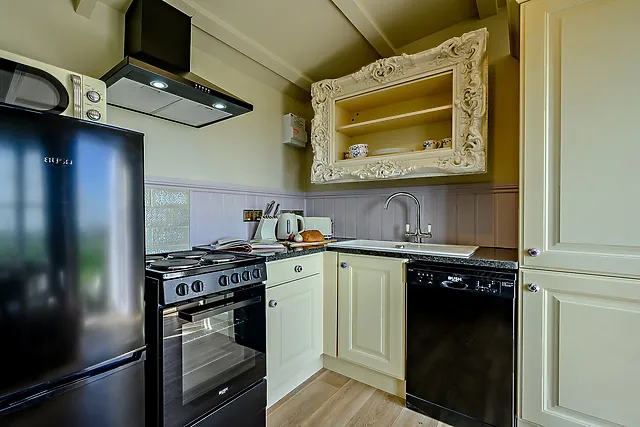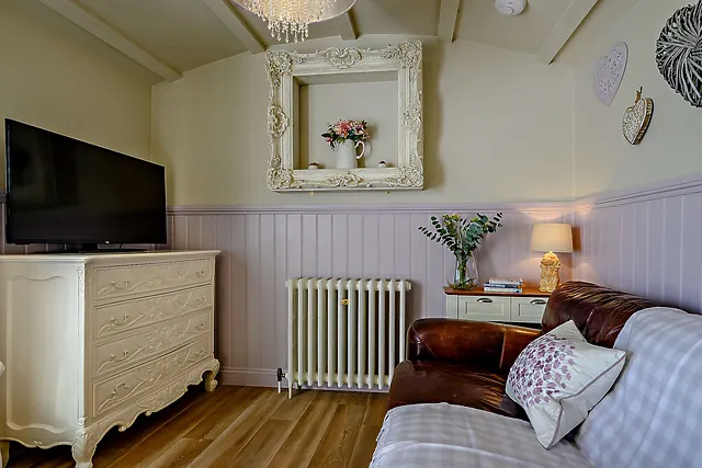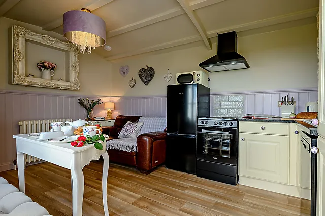 The accommodation boasts a king-size bed, a smartly equipped kitchen, and a snug living area with a Smart TV, perfect for cosy evenings in.