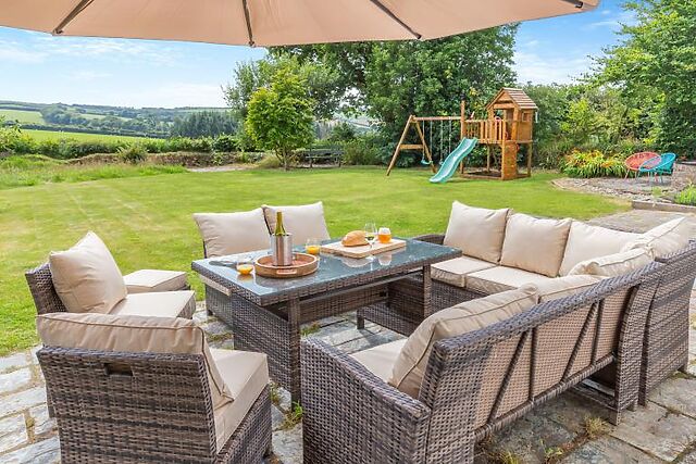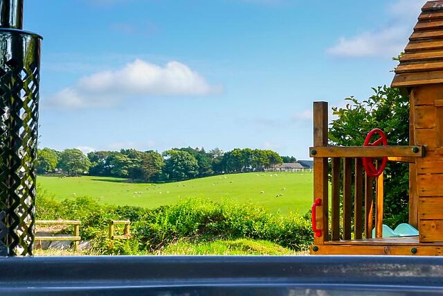 Unwind in the luxurious hot tub while taking in the serene views of fields where horses and livestock graze. The garden also features a play area for children, a BBQ for al fresco dining, and a cold plunge bath for cooling down.