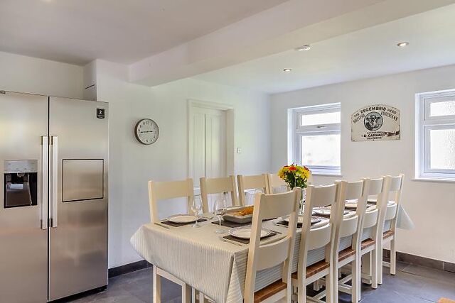 The main lounge welcomes you with a smart TV and a cosy log burner, while the spacious open-plan kitchen/diner is perfect for family meals. The kitchen is well-equipped with a range cooker, coffee machine, and a fridge freezer with an ice and water dispenser.