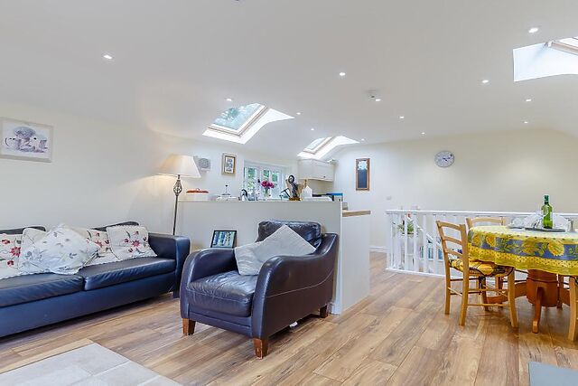 Upstairs, the living space is light and airy, with the lounge/kitchen/diner in an open-plan layout. The lounge has a comfortable sofa and armchair, TV, DVD, wood burner and French doors leading out onto the enclosed decked area with a small table and chairs and private hot tub to the right of the decking.