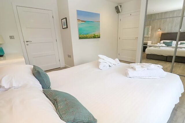 Three thoughtfully styled bedrooms provide flexible sleeping arrangements. The first is a twin that can be configured as super king on request, while the second offers a king size with its own TV and a sleek en-suite featuring a walk-in shower, basin, heated towel rail and WC.
